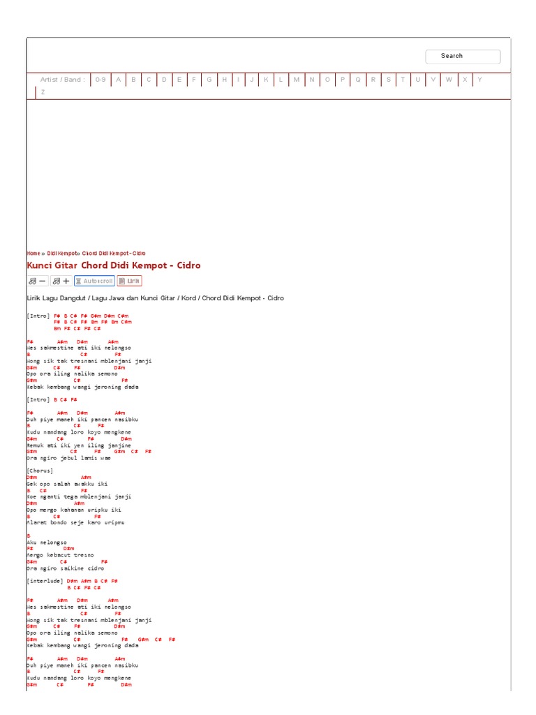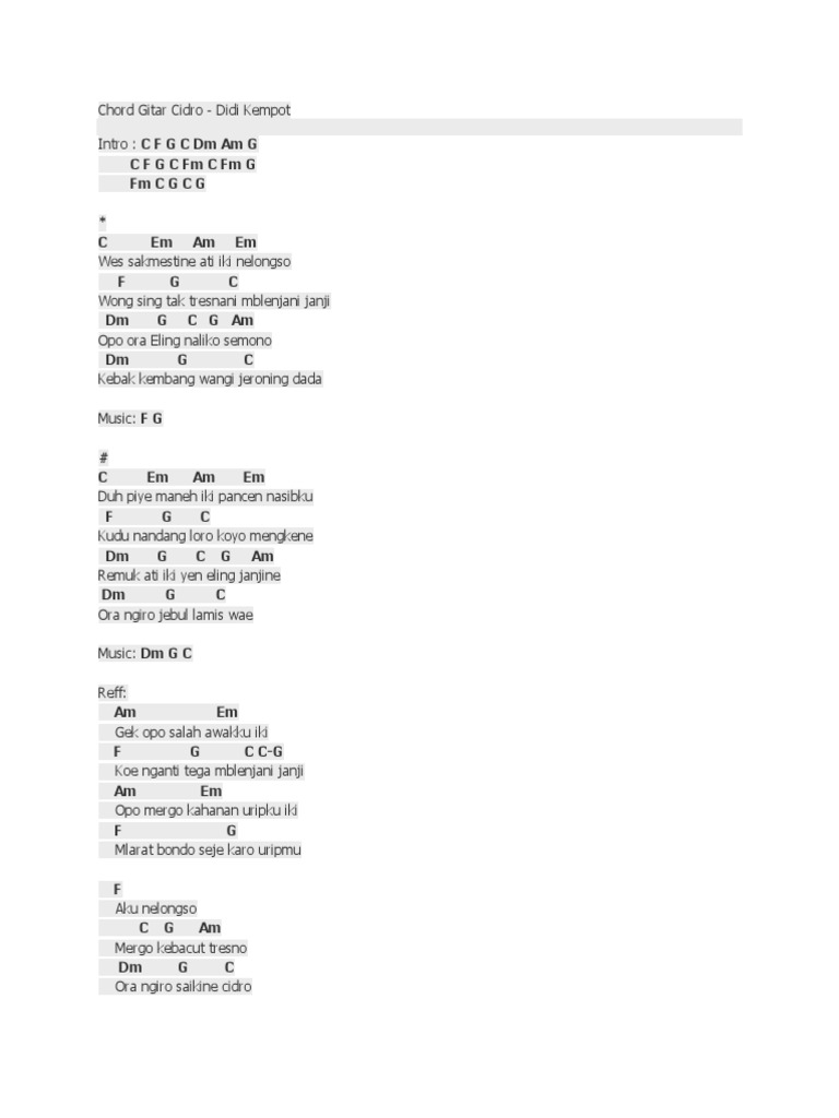 C F C Cidro janji tegane kowe ngapusi Am Em Nganti seprene suwene aku ngenteni F G Em Am nangis batinku nggrantes uripku F G C teles kebes netes eluh neng dadaku Bridge Am Em F Am Am Em F G C Chorus C Em Dudu klambi anyar F sing neng. Cidro janji tegane kowe ngapusi Am Em Nganti seprene suwene aku ngenteni F G Em Am Nangis batinku nggrantes uripku F G C Teles kebes netes eluh neng dadaku Music. 1 of 17.