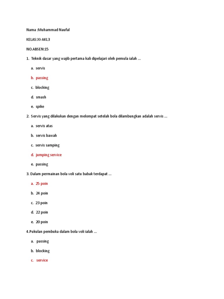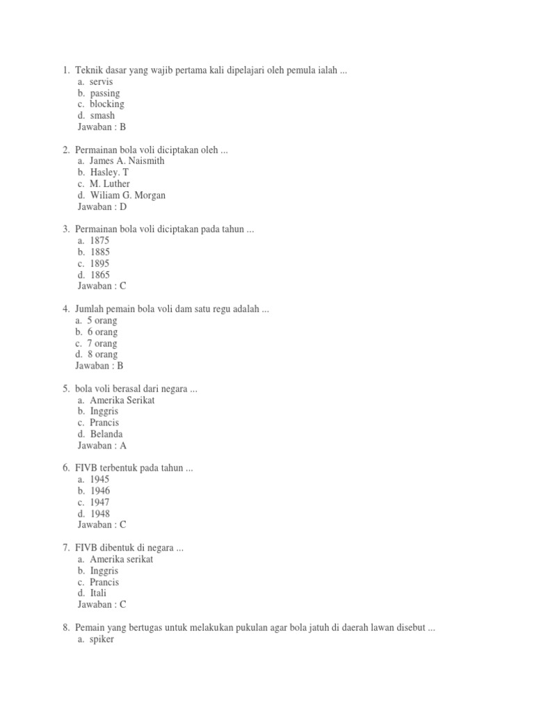 Semoga Contoh Soal Pilihan Ganda Bola Voli Lengkap Jawabannya ini bermanfaat banyak. 2 days ago Mempelajari tentang teknik dasar pencak silat pemula sangat penting bagi Anda yang ingin menguasai beladiri satu ini. Permainan bola voli diciptakan oleh Wiliam G.