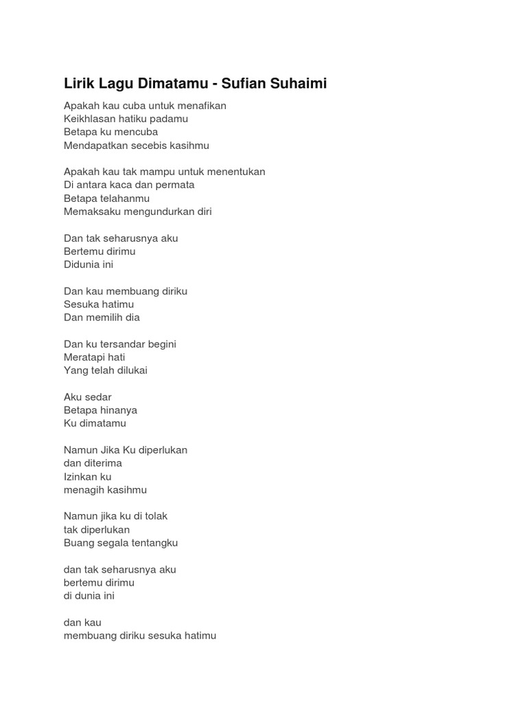 Chord Sufian Suhaimi Di matamu - INTRO Am Dm E Am AmApakah Kau cuba Dmuntuk menafikan EKeikhlasan Hatiku Ampadamu GBetapa Ku Fmencuba DmMendapatkan Secebis Ekasihmu AmApakah Kau tak mampu Dmtuk menentukan EDi Antara kaca dan Ampermata GBetapa TelahanmuF DmMemaksaku Mengundurkan Ediri Dan FTak seharusnya Gaku Bertemu DirimuE Didunia AmIniG Dan FKau membuang Gdiriku Sesuka HatimuE Dan. KUNCI GITAR LAGUNYA MAULANA WIJAYA SEHARUSNYA AKU Cord Nada Rendahmohon di maafkan yah man - teman klo suara saya jelek niat cuma mau share kunci gitarn. C F Ku tak bahagia melihat kau bahagia dengannya Dm G C Ku tak bahagia melihat kau bahagia Reff 2 F G Harusnya aku yang disana Em Am Dampingimu dan bukan dia Dm G C Harusnya aku yang kau cinta dan bukan dia F G Harusnya kau tahu bahwa Em Am Cintaku lebih darinya Dm G C Harusnya yang kau pilih bukan dia.