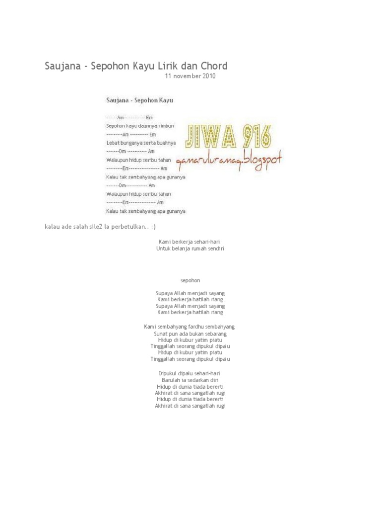 Saujana - Sepohon Kayu Chord 1 Am E Sepohon kayu daunnya rimbun Am E Lebat bunganya serta buahnya Dm Am Walaupun hidup seribu tahun E Am Kalau tak sembahyang apa gunanya Dm Am Walaupun hidup seribu tahun E Am Kalau tak sembahyang apa gunanya Am E Kami berkerja sehari-hari Am E Untuk belanja rumah sendiri Dm Am Walaupun hidup seribu tahun E Am. Berikut chord kunci gitar Sepohon Kayu Uje Ustad Jefri Al Buchori. Download Lagu Umam Sepohon Kayu Mp3.