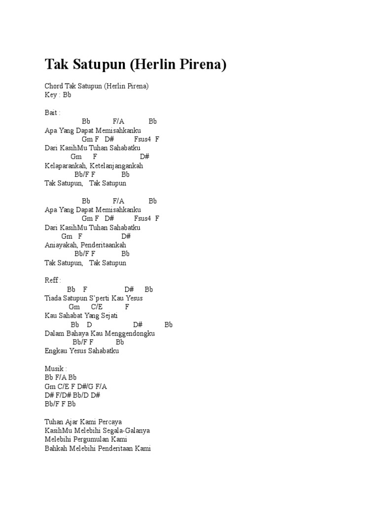 Chord lagu tak satupun. Selembut belaimu dm f g c tak ada satupun yang mampu menjadi sepertimu. Verse I D DF Kala Kucari Damai G D Hanya Kudapat Dalam Yesus D Bm Kala Kucari Ketenangan E A Hanya Kutemui Di Dalam Yesus Verse II D DF Tak Satupun Dapat Menghiburku G D Tak Seorangpun Dapat Menolongku D A D A Hanya Yesus Jawaban Hidupku Chorus D Bersama Dia Hatiku Damai G D Walau Dalam Lembah Kekelaman D Bm Bersama Dia Hatiku Tenang E A Walau Hidup Penuh Tantangan Verse II D DF Tak Satupun Dapat Menghiburku G D Tak. Download Lagu Tak Satupun - Herlin Pirena - Hallo sahabat Lirik Lagu dan Chords Pada Artikel Lirik lagu dan chord yang anda baca kali ini dengan judul Download Lagu Tak Satupun - Herlin Pirena kami telah mempersiapkan Lirik Lagu dan Chords ini dengan baik untuk anda gunakan dalam karaoke maupun bermain musikMudah-mudahan isi postingan kali ini Herlin Pirena kali ini.